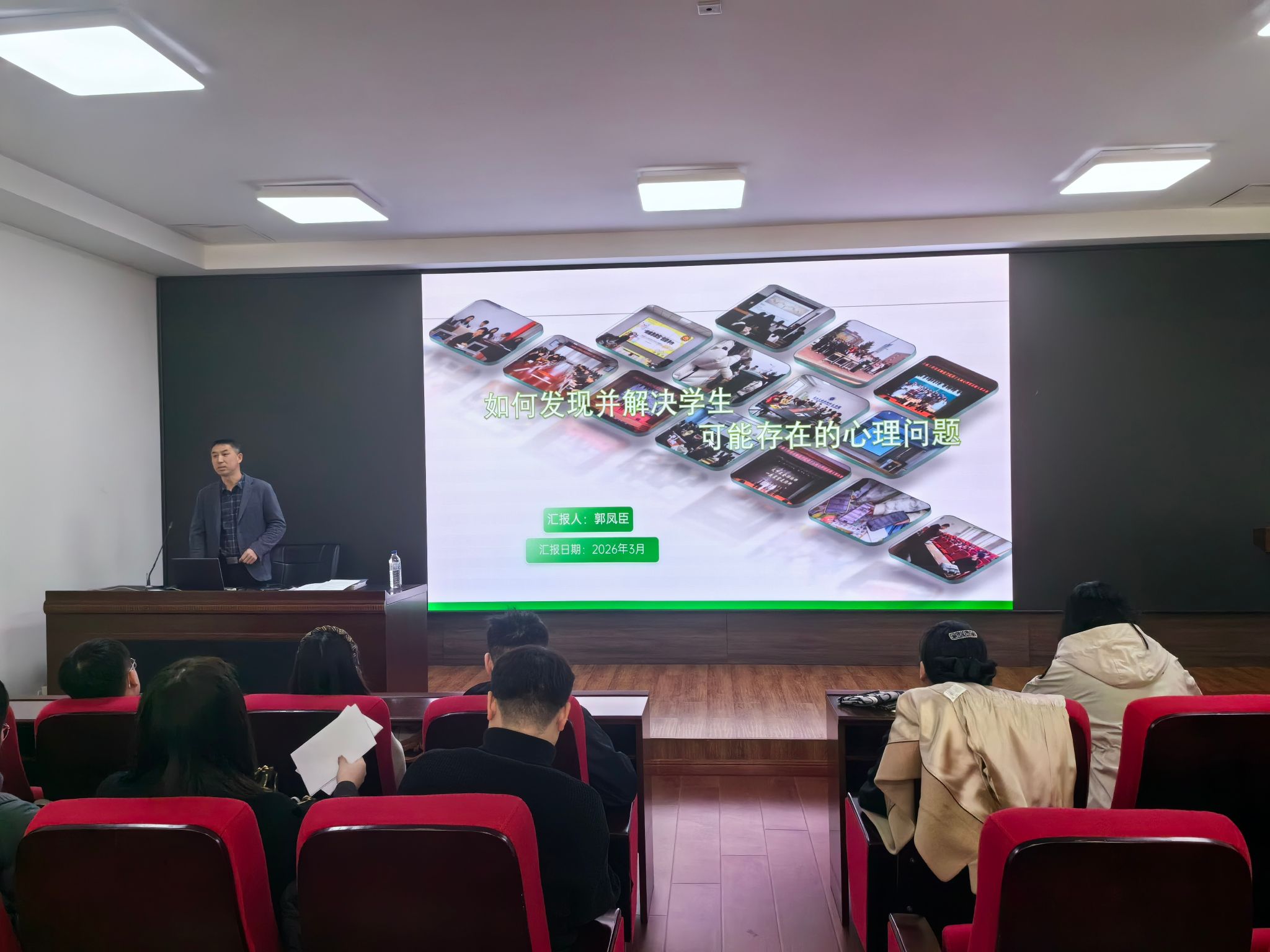 为进一步提升辅导员心理健康教育工作能力,筑牢校园心理安全防线,4月1日,学校在行政楼412会议室开展“大学生心理问题识别与干预能力提升”专题培训。本次培训由大学生心理健康教育咨询中心副主任、学生工作部副部长郭凤臣主讲,全体辅导员、学工干部参加培训。