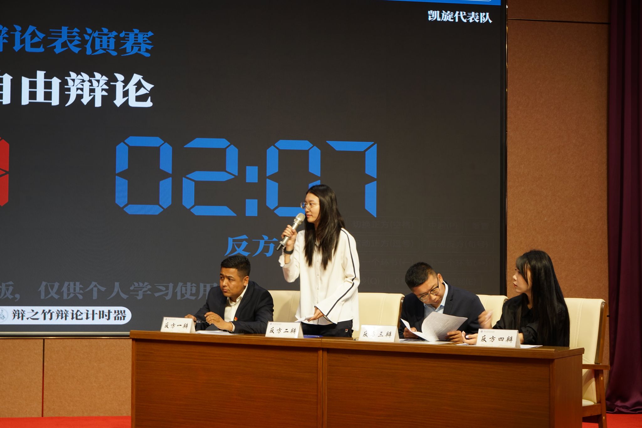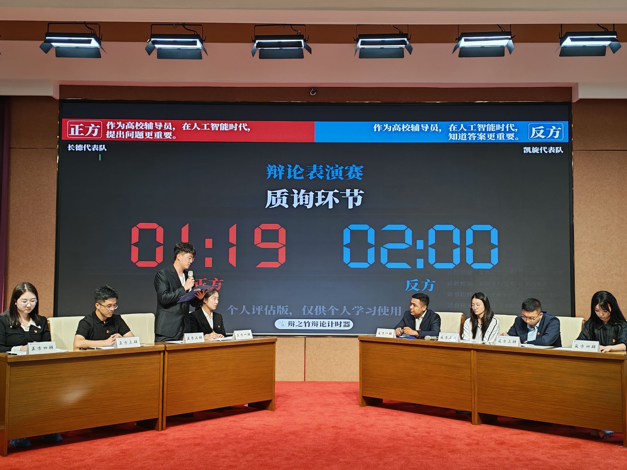 互动环节中,长德与凯旋两个校区代表队以“身为高校思政辅导员,在人工智能时代,提出问题和知道答案哪个更重要?”为辩题展开激烈交锋。双方辩手引经据典、逻辑清晰,结合工作实际展开辩论,不仅展现了扎实的专业素养与思辨能力,更引发了在场学工干部的深度思考。最后长德代表队(提出问题更重要)以微弱的优势获胜,长德校区代表队黄程远与凯旋校区代表队董朔分别获得最佳辩手。
