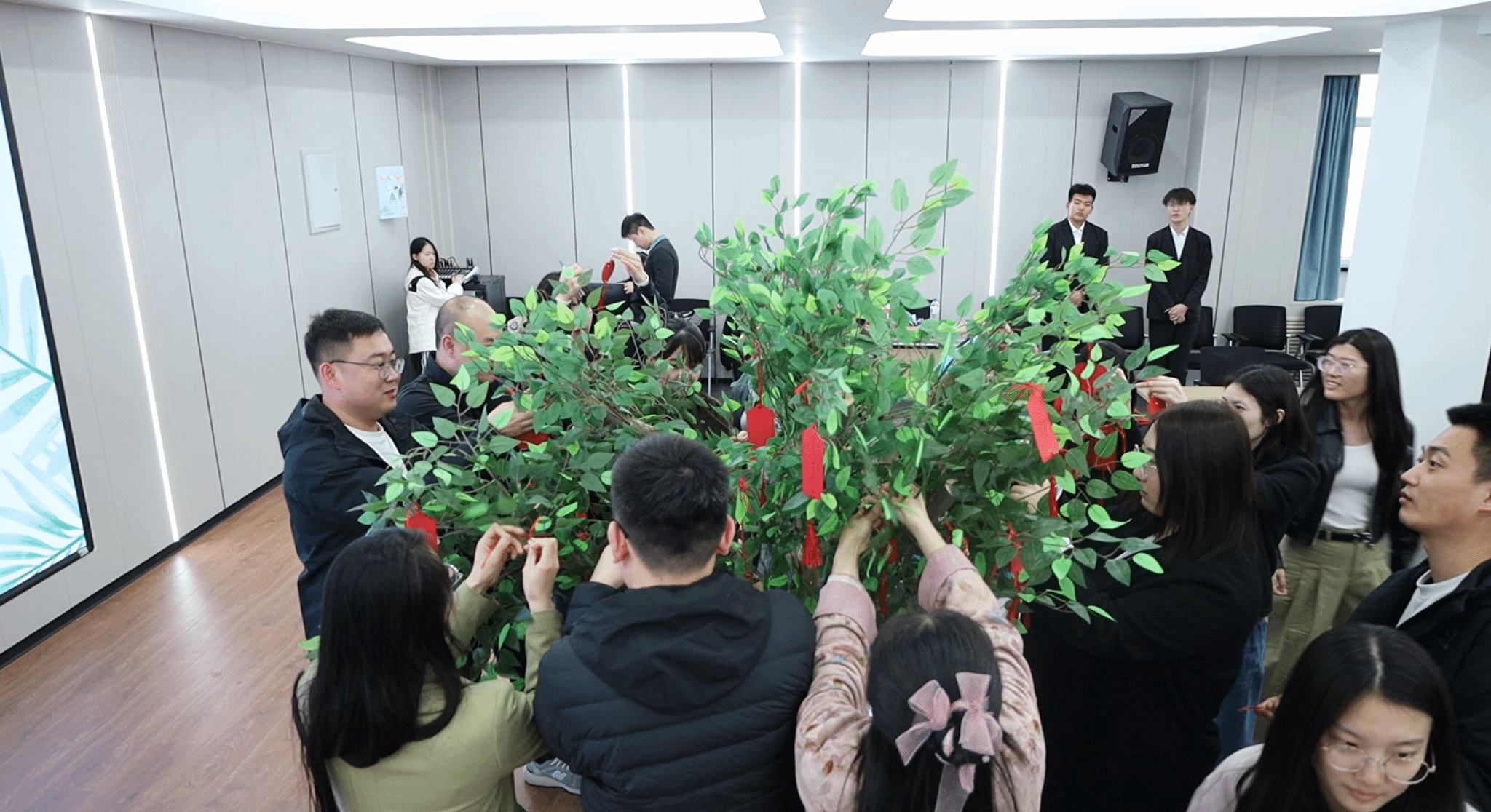分享结束后,全体人员共同参与“润心能量树”仪式,大家将书写感悟的心情卡片悬挂于能量树上,让点滴育人初心汇聚成星河。现场准备了美食能量与情绪盲盒,在温馨互动中传递温暖、凝聚共识,进一步强化辅导员队伍的向心力与归属感。